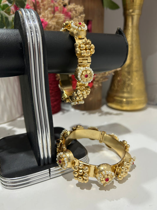 Antique Gold-Plated Pearl & Ruby Kada Bangles (Set of 2)