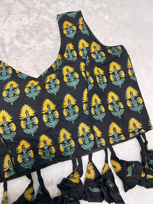 Black and Gold Handblock Printed Tassel Blouse