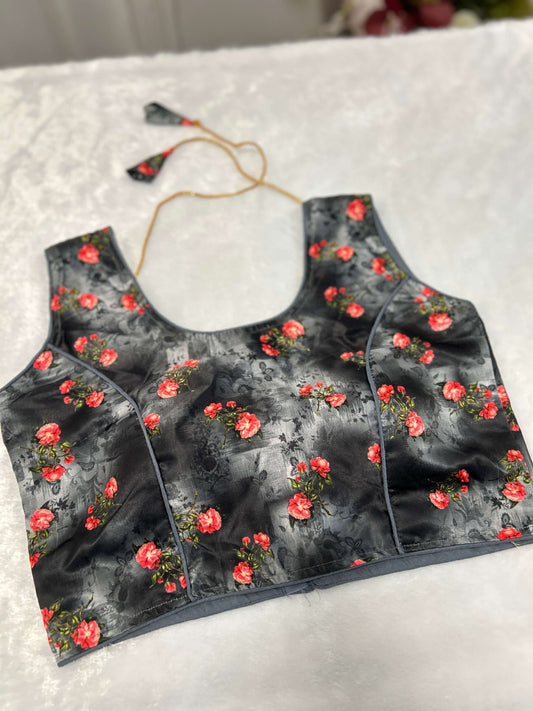 Black Floral Satin Padded Blouse