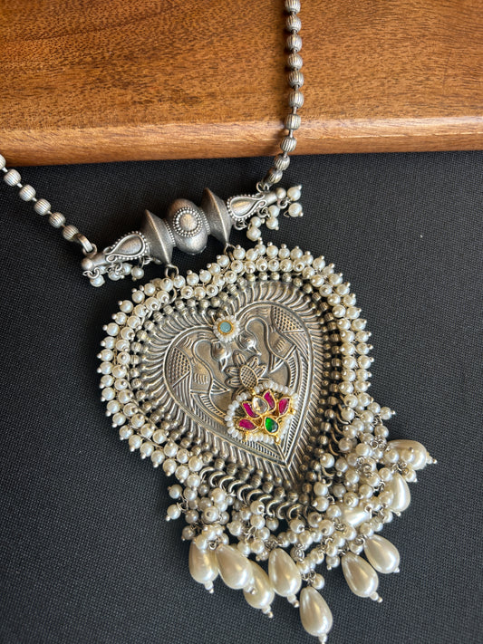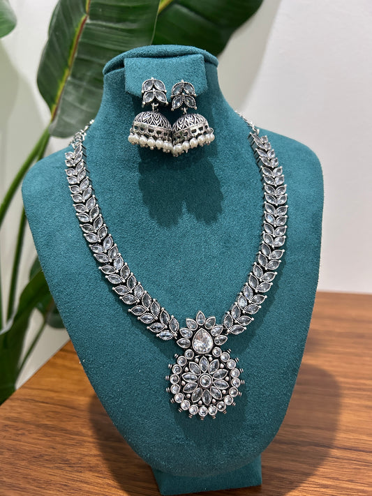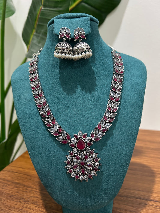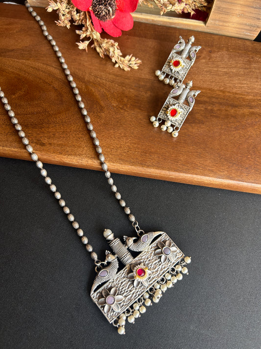 Oxidized Silver Multicolor Stone Necklace with Earrings