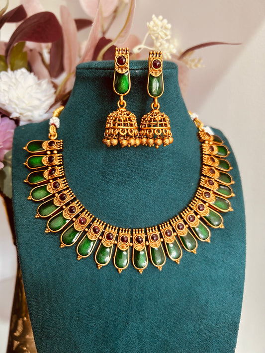 Royal Green Enamel Gold-Tone Choker Necklace Set with Jhumka Earrings