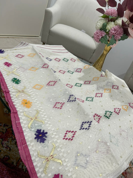 Half silk jamdani saree in a structured white texture with magenta stripes