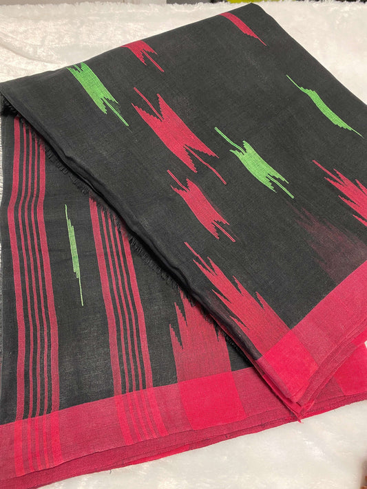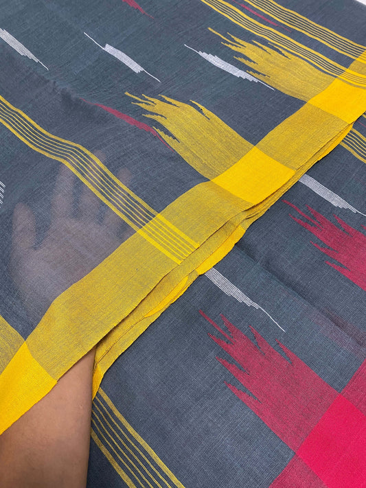 Charcoal Grey Manipuri Handloom Saree with Red and Yellow Accents