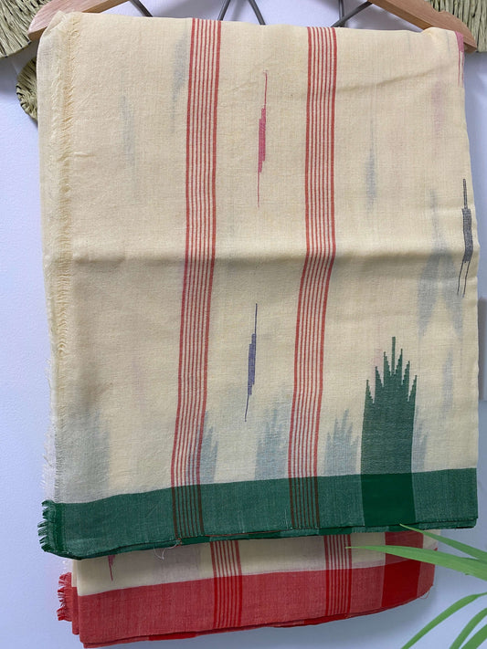 Ivory Manipuri Handloom Saree with Red and Green Borders