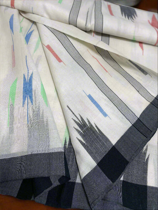 White Manipuri Handloom Saree with Black and Multicolor Accents