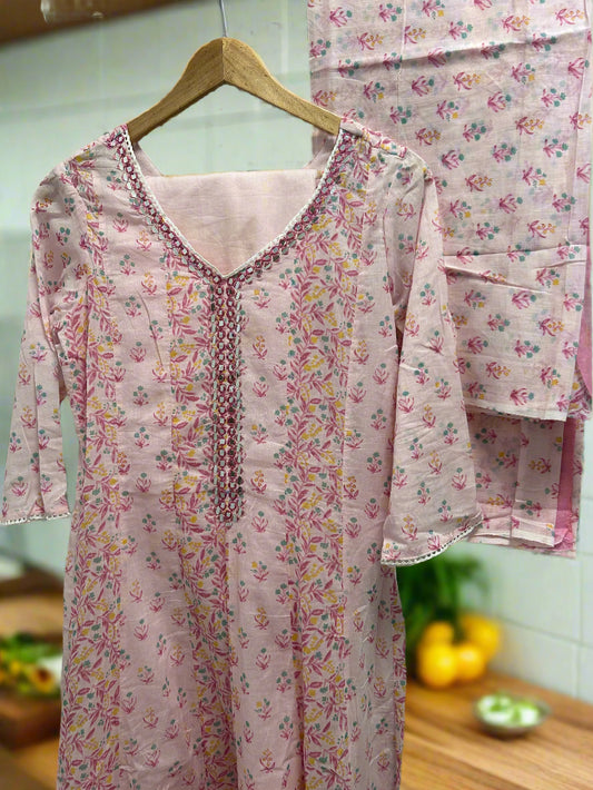 Floral Pink Cotton Dress with Matching Pants and Dupatta